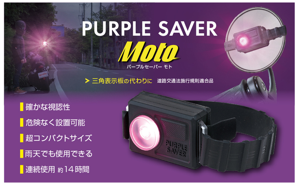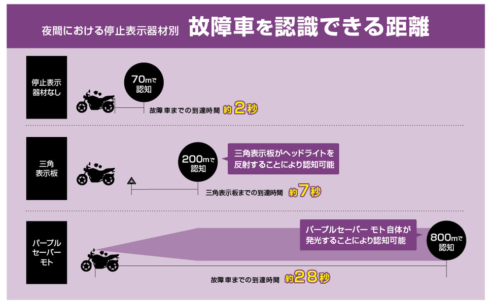 一方、パープルセーバーのようなLED表示灯は、自ら強力な紫色の光を「発光」する、能動的な(アクティブな)信号です。製品仕様によれば、その視認距離は夜間で約1,000m、昼間でも約500mに達します。これは、後続車のドライバーに対して圧倒的に早く、そして明確に異常事態の発生を知らせることができることを意味します。